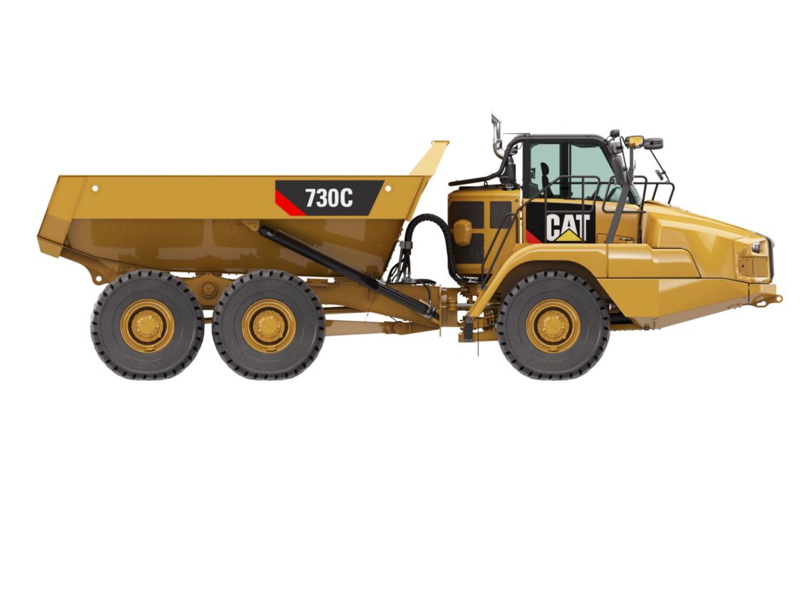 Homme portant un casque de chantier et un gilet de sécurité, sur un site de construction avec des CAT en arrière-plan